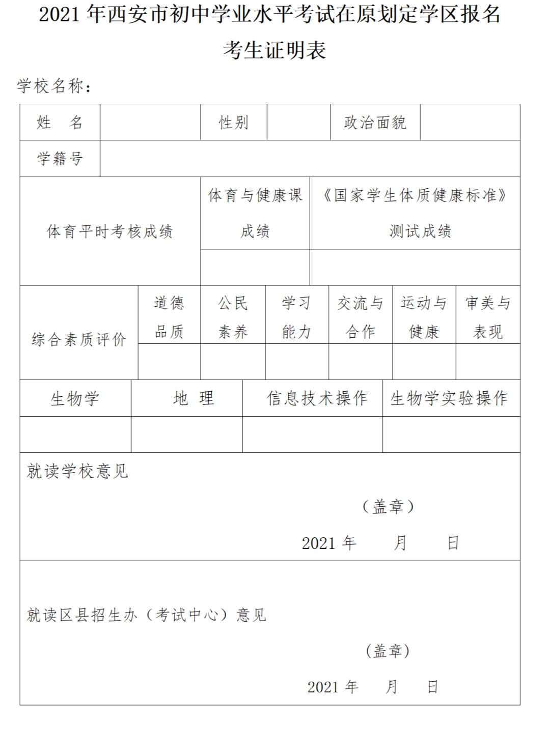 附件二:西安市初中学业水平考试在原划定学区报名考生证明表