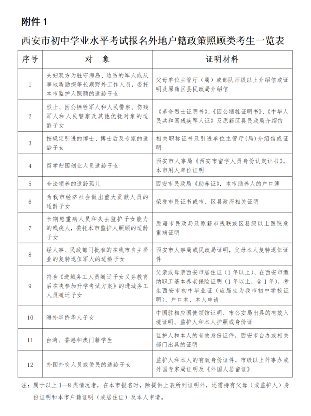 ① 进城务工人员随迁子女还须同时具备以下条件:父亲或母亲持西安市居住证1年以上(含1年),按照国家规定在西安市缴纳职工基本养老保险1年以上(含1年),我市初中学校毕业。